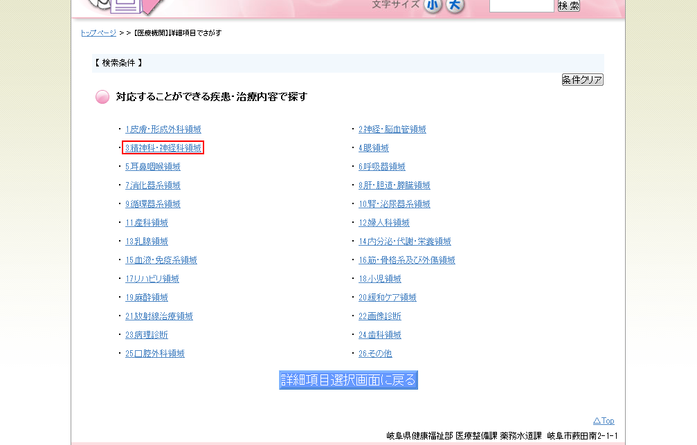 2.「対応することができる疾患・治療内容で探す」をクリックします