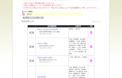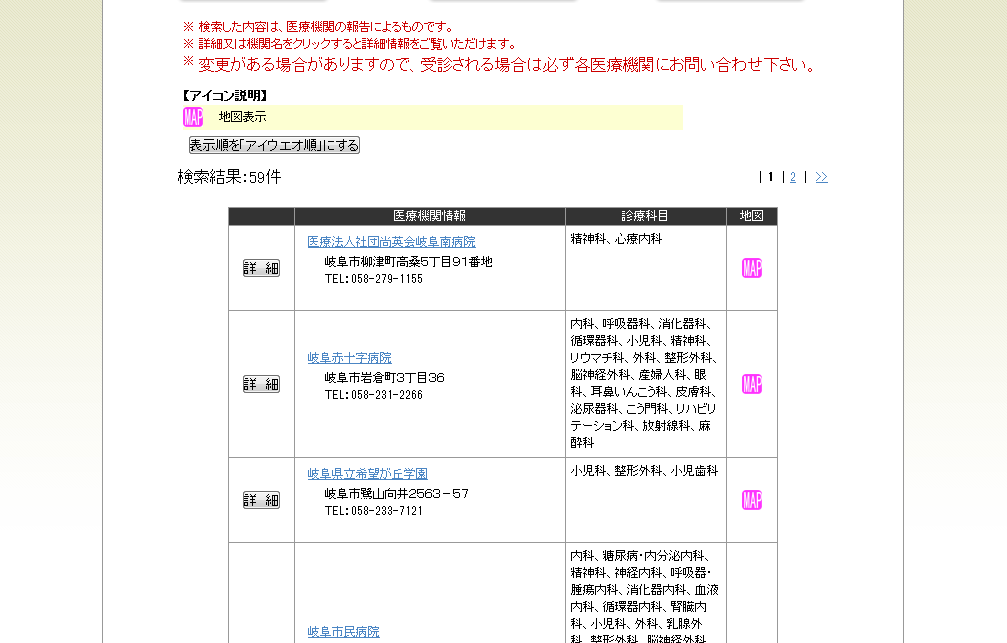 5.検索結果一覧が表示されます。行きたい病院をクリックしてください(大人と子どもの区別なく表示されるため、電話などでお問い合わせください)