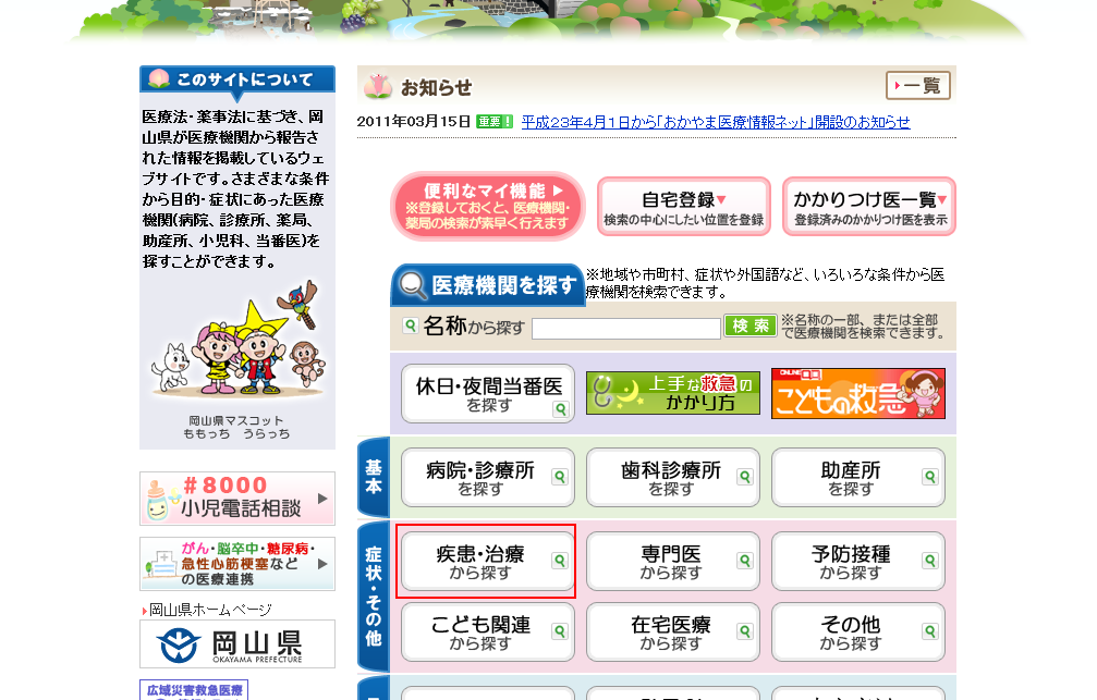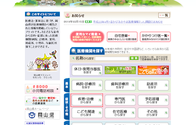 岡山県での発達障害を診断してくれる病院の探し方 waisu 公開日: 2011年8月3日 カテゴリー: 診断 コメントはまだありません 岡山県で発達障害を診断してくれる病院の探し方が分かったので書いておきます。 実際の調査結果である岡山県で大人(成人)の発達障害を診断してくれる病院をご覧ください おかやま医療情報ネットにアクセスし、下記のガイドに従ってください 1.「疾患・治療から探す」をクリックします 2.「発達障害(自閉症、学習障害等)」をクリックし、「検索」ボタンをクリックします。 3.「この条件で結果を表示」ボタンをクリックします。 4.検索結果一覧が表示されます。(成人、子ども両方表示されるので、電話などで成人が受診可能かご確認ください。)5.「診療内容」をクリックします。 6.「発達障害(自閉症、学習障害等)」と「臨床心理・神経心理検査」があることを確認します。