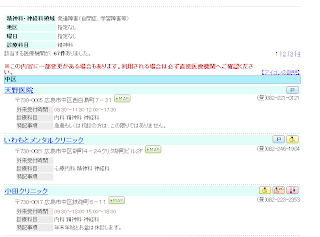 5.検索結果一覧が表示されます。行きたい病院をクリックしてください(大人と子どもの区別なく表示されるため、電話などでお問い合わせください)
