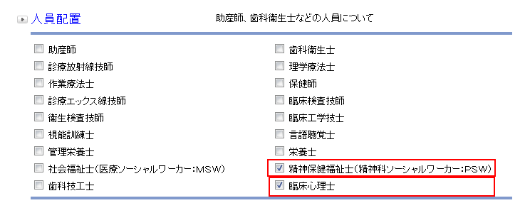 5.「人員配置」→「精神保健福祉士」と「臨床心理士」をクリックします。