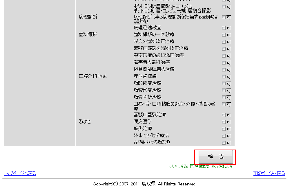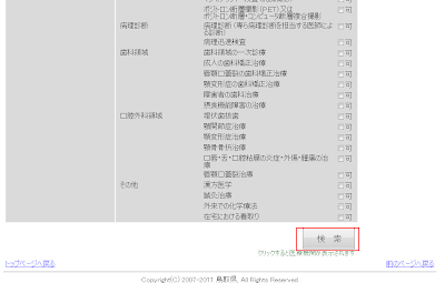 鳥取県で発達障害を診断してくれる病院の探し方 waisu 公開日: 2011年8月8日 カテゴリー: 診断 コメントはまだありません 鳥取県で発達障害を診断してくれる病院の探し方が分かったので書いておきます。 実際の調査結果である鳥取県で大人(成人)の発達障害を診断してくれる病院をご覧ください 鳥取県福祉施設等情報公表サービスにアクセスし、下記のガイドに従ってください なお診断する前に準備したほうが良いものは全国共通なので、下記の全国版リンクをご覧ください。全国の病院(発達障害診断) 1.「医療機関・薬局検索」をクリックします 2.「病院」or「診療所」をクリックします。 3.「鳥取県全域」をクリックし、「次へ」ボタンをクリックします。 4.「オプション検索(詳細検索)」をクリックします。 5.発達障害を探し、「発達障害(自閉症、学習障害等)」と「臨床心理・神経心理検査」のチェックボックスをクリックし、下のほうにスクロールします。 6.「検索」ボタンをクリックします。 7.検索結果一覧が表示されます。行きたい病院をクリックしてください(大人と子どもの区別なく表示されるため、電話などでお問い合わせください)
